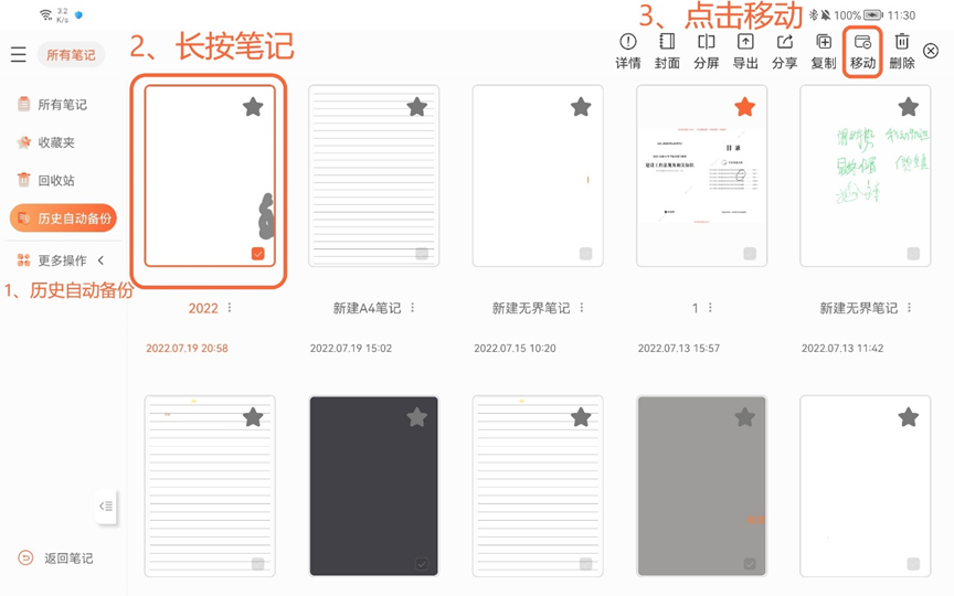 详细步骤:本地历史备份长按笔记→移动→所有笔记目录→粘贴