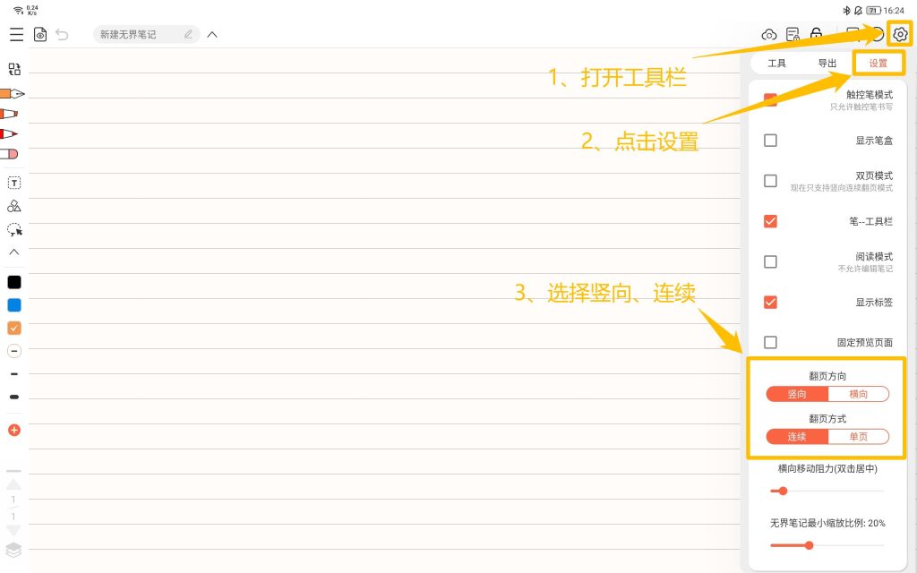 答:这是因为单页翻页模式下页面会自适应屏幕大小,可在工具栏(设置)中打开“竖向连续翻页”即可缩小页面。